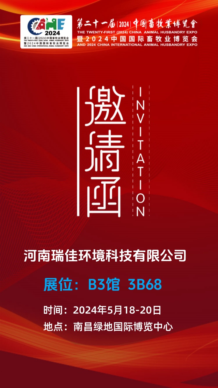 河南瑞佳環(huán)境科技有限公司與您相約第二十一屆(2024)中國畜牧業(yè)博覽會 展位號:B3館 3B68 5月18-20日不見不散!